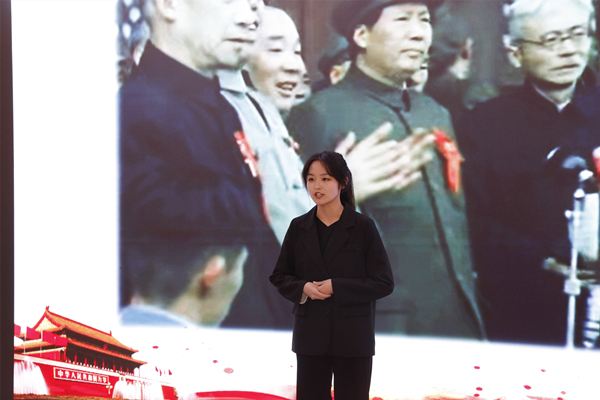 万里长征是中国共产党的伟大决定,2020级财务管理一班王子扬和孙樱娜以对话的形式,伴随大屏幕上的虚拟场景开始讲解,给人以长征途中身临其境的感觉。2020级物业管理专业张子以开国大典上的一张照片中细小的故事,以小见大,引人入胜。带领大家忆百年峥嵘岁月,谱盛世青春华章。
